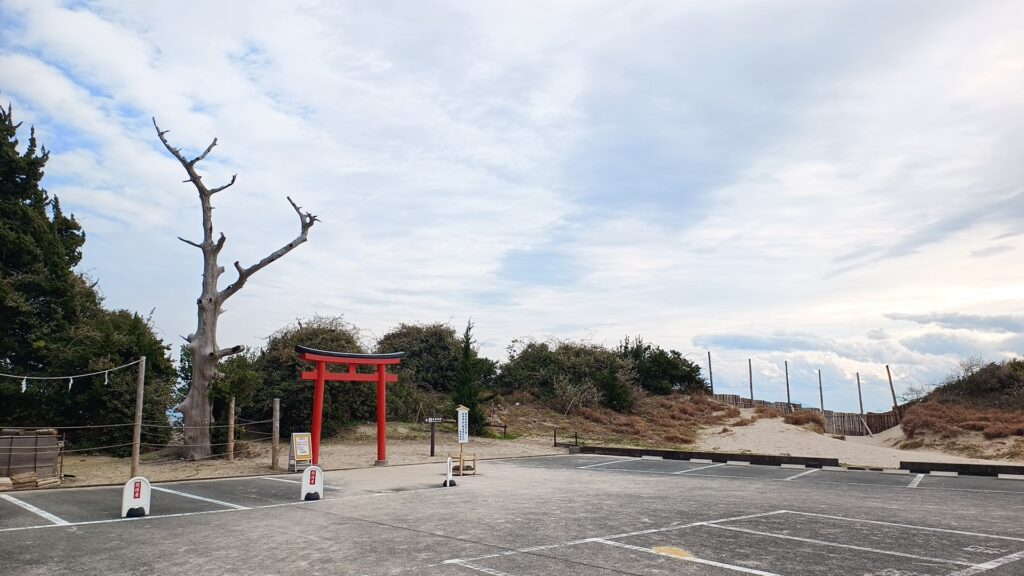 境内を抜け駐車場に戻ると、海岸へ向かう入口に鳥居が。
