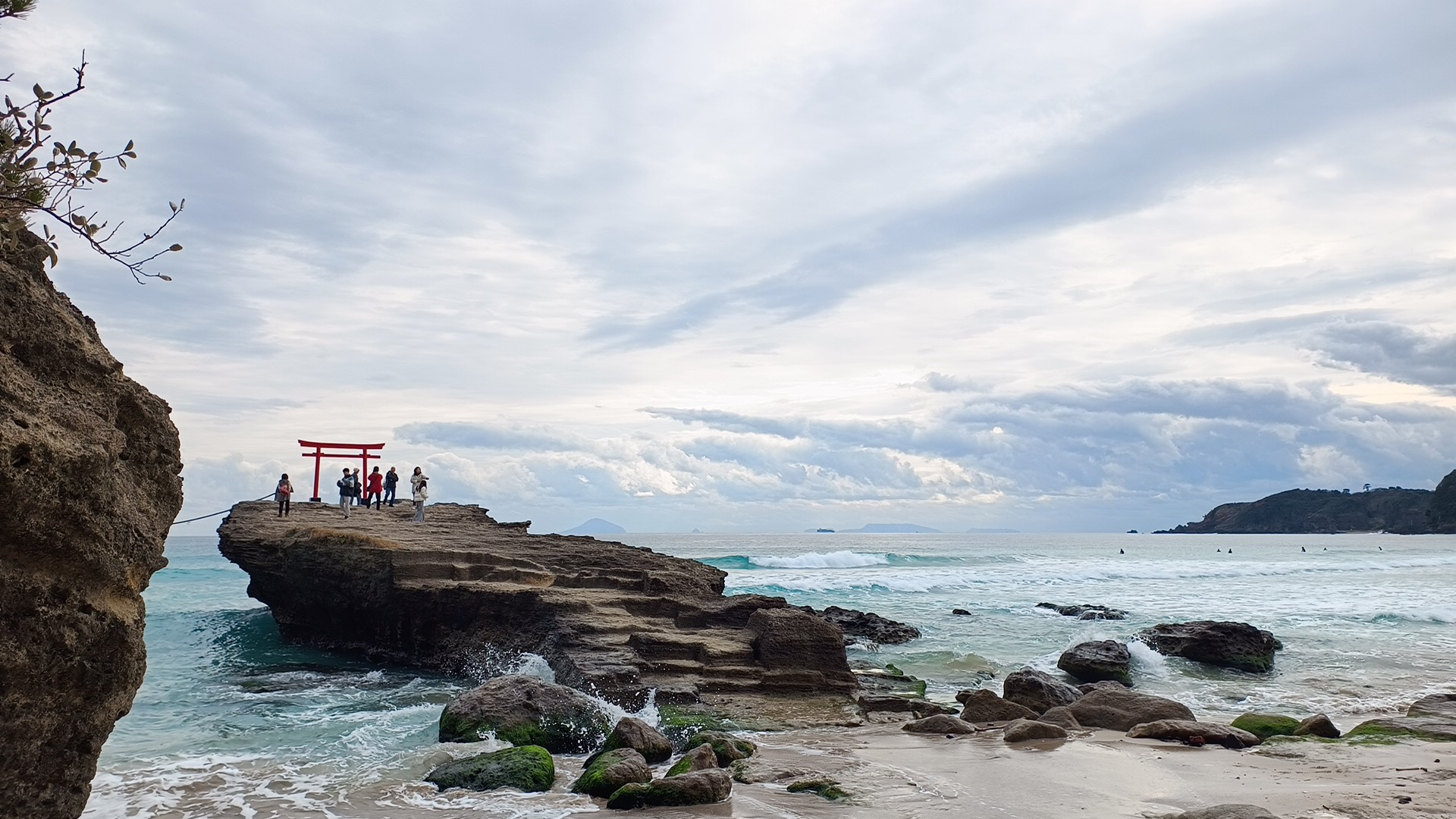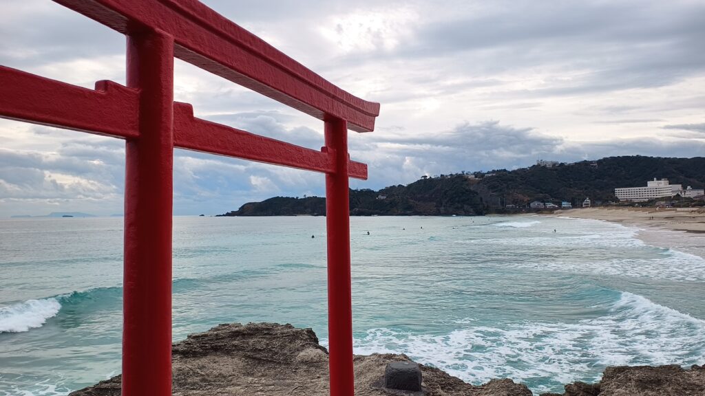 手前には巨岩に建つ鳥居、奥には初乗りを楽しむサーファー