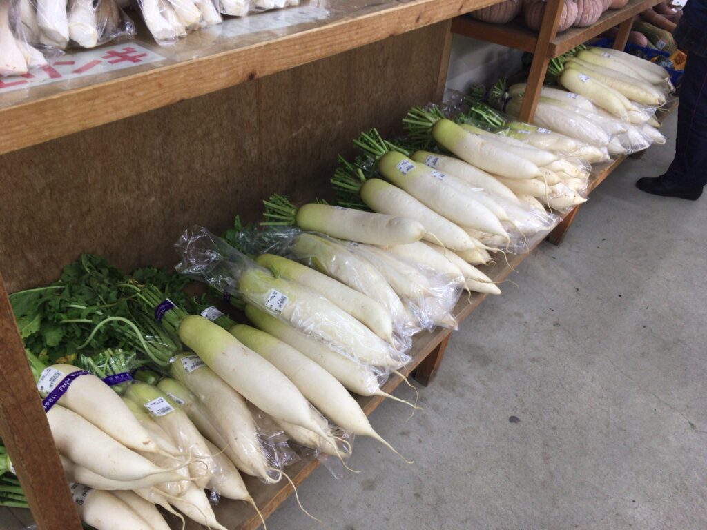 中に入るとこんな感じです。下田市周辺の農家さんたちの手作り野菜や果物がずらりと並びます。今の時期は白菜や大根、みかんが棚の多くを占めていました。立派な大根は1本120円。