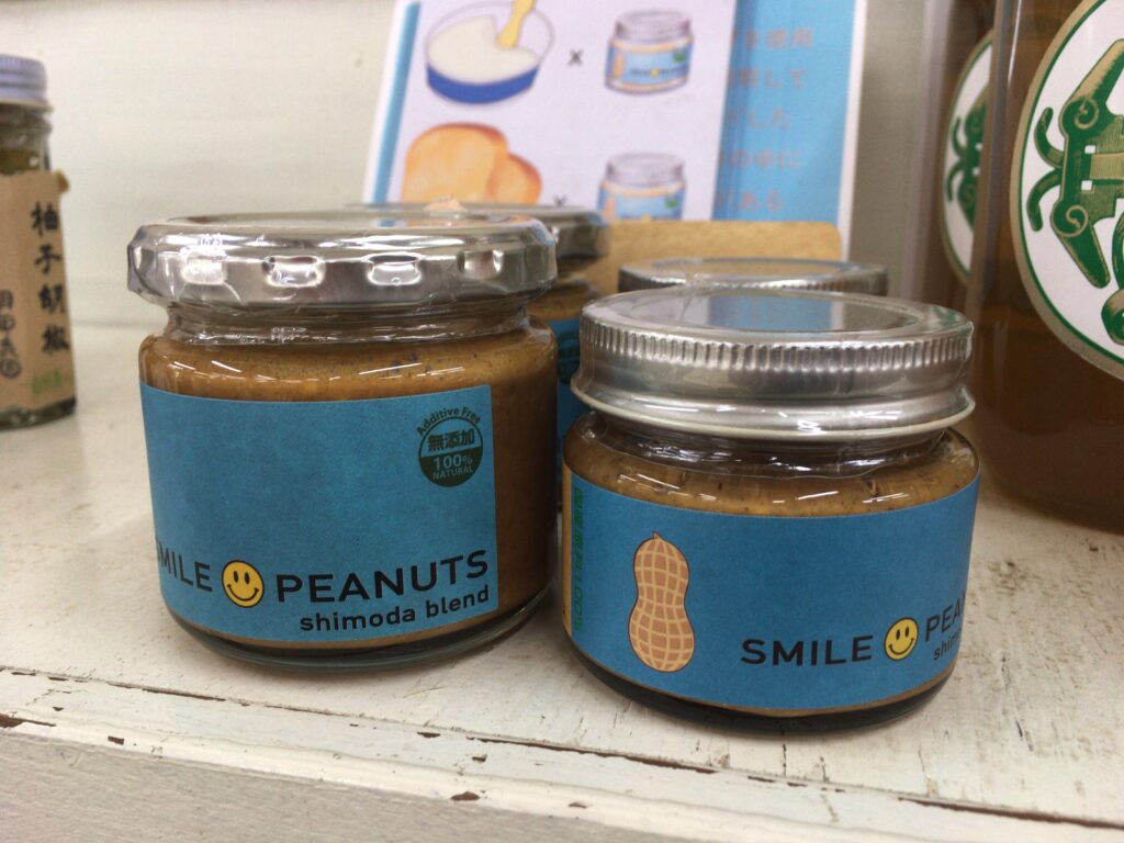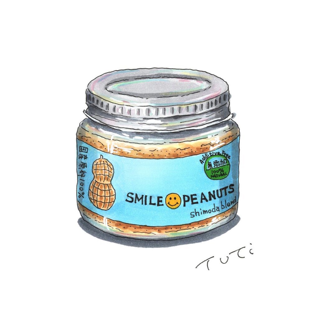野菜の他には、手作りのパンやお菓子、卵、コーヒー豆、お惣菜などなど、様々な地場産品が並び、下田(周辺地域含む)の美味しいものを発見できます。これは、土屋家お気に入りのピーナッツクリームです。偶然にも、商品に出会った後に夫が生産者の知り合いから間接的にイラスト依頼のお仕事をいただき、商品を描かせてもらいました。(写真の奥にも薄っすら写ってます)