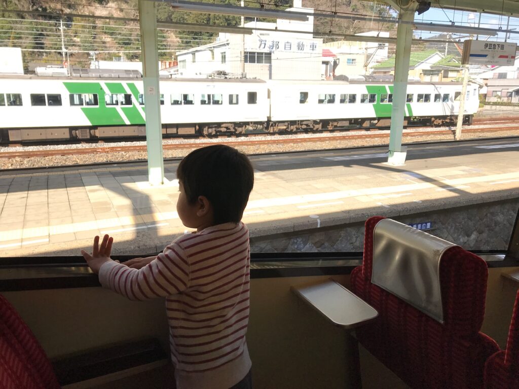 まるで旅をしたかのような紹介をしておりますが、この写真は2017年に運行開始記念として、下田市民向けに車内の一般公開が行われた時に撮影したものです。当時生後2ヶ月の息子を連れており、優しいクルーの方々が何枚も家族写真を撮ってくださいました。今では電車好きに成長した息子と一緒に、下田駅へ電車を見にいくこともしばしば。下田駅〜蓮台寺駅の1区間だけ黒船電車に乗って楽しんだこともありました。まるでアトラクションに乗るかのような楽しみ方。窓の向こうに見えるのは、2021年3月に引退してしまった185系の踊り子。(乗車時は2021年2月)