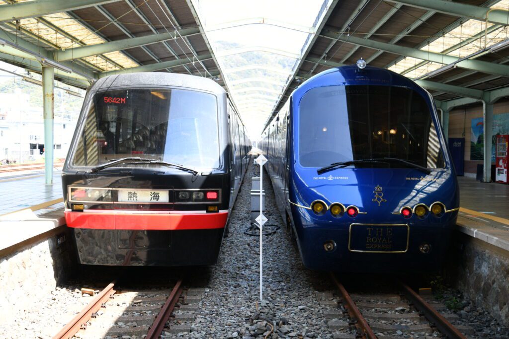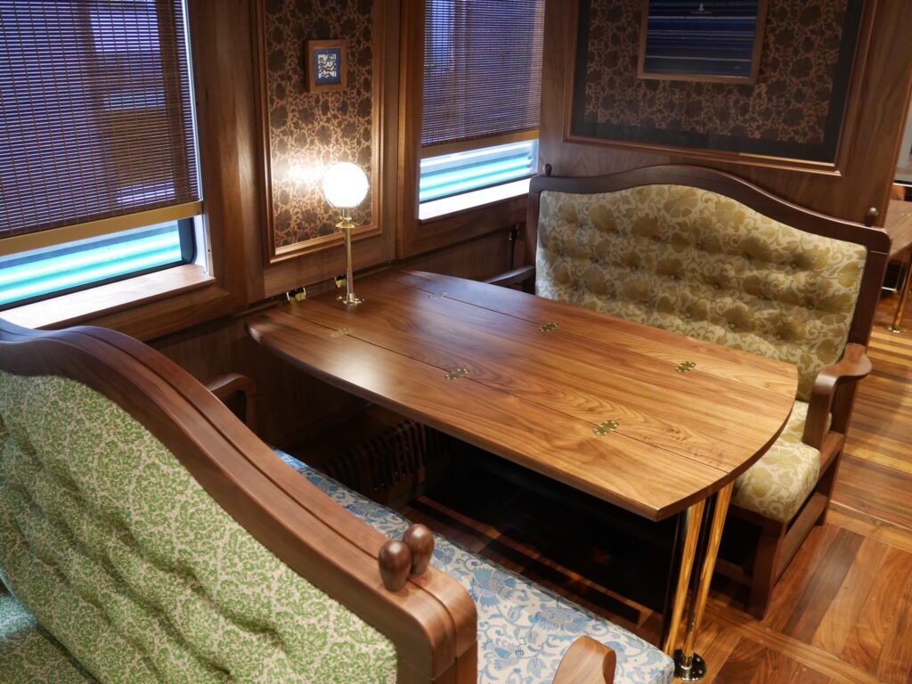 青い車体のザ・ロイヤルエクスプレスは横浜〜伊豆急下田駅を運行する豪華列車。とても電車内とは思えない豪華さです。