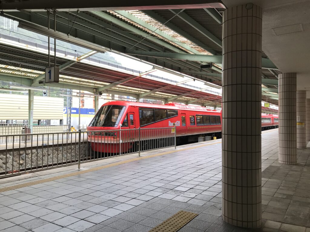 下田駅では、日常的に(本数は多くありませんが)観光列車と出会えます。ホームに止まっているのはキンメ電車。