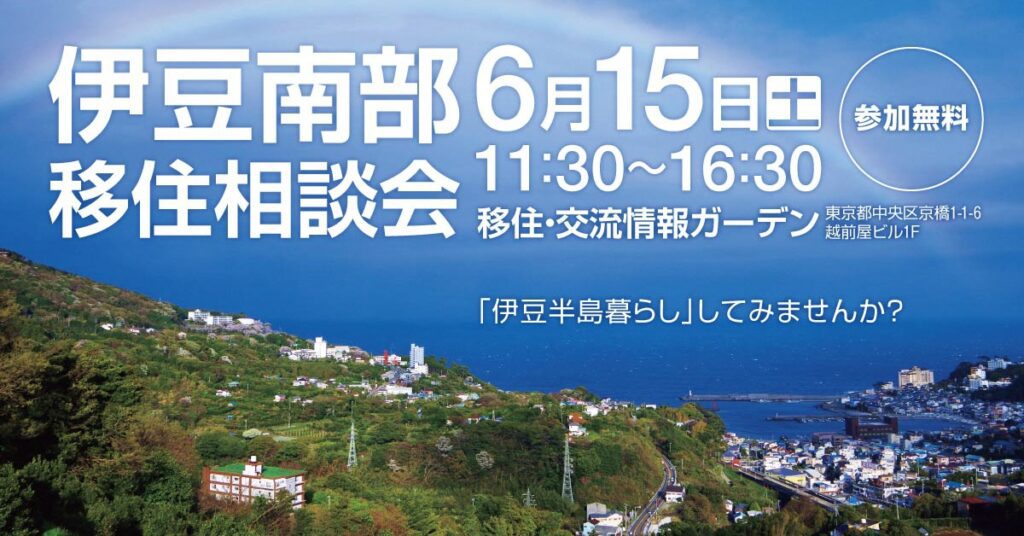 伊豆南部(下田市・東伊豆町・河津町・南伊豆町・松崎町・西伊豆町)とハロワーク下田が参加する相談会になります。具体的な地域が決まっていない方もふわっと移住を検討している方も大歓迎です!
