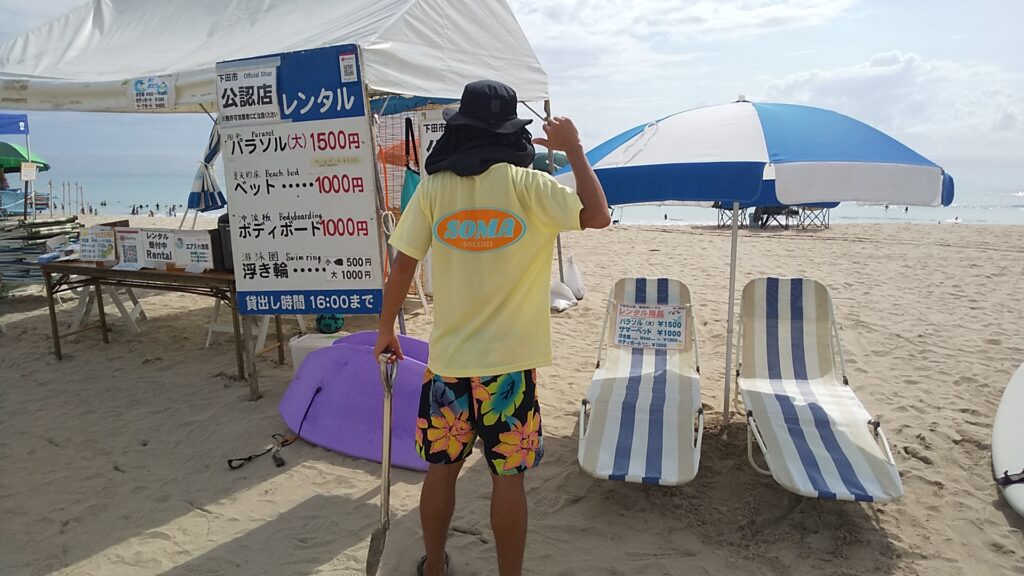 仕事はパラソルやサマーベッド、うきわなどのレンタルの貸出です。