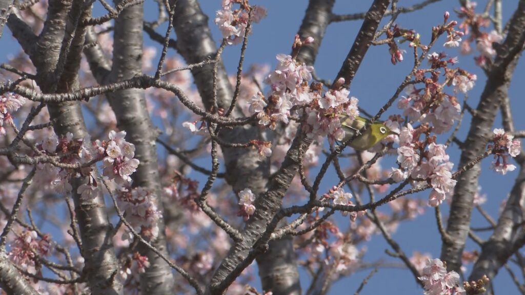 実は寒桜はほかの桜に比べて蜜が多いらしく、甘党のメジロが夢中で吸蜜に訪れるそうです。